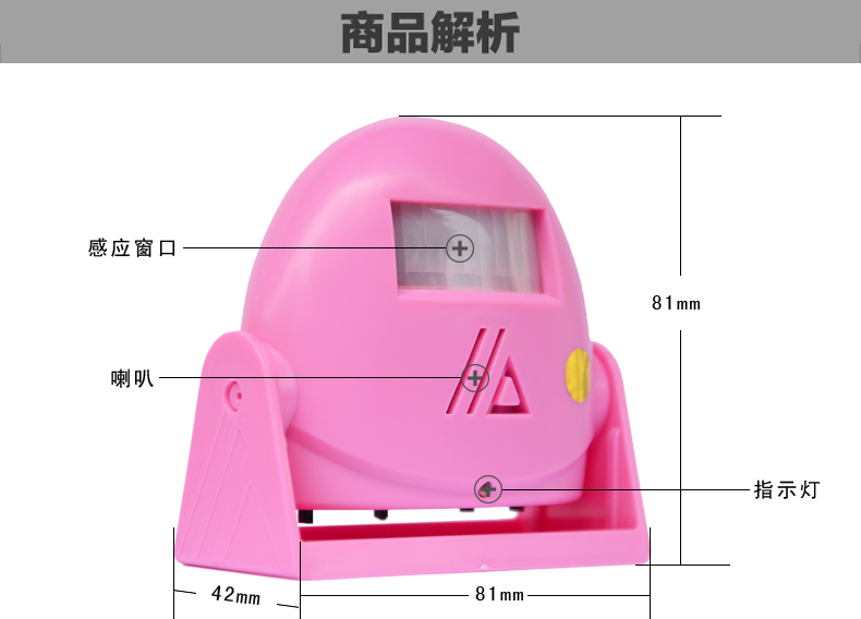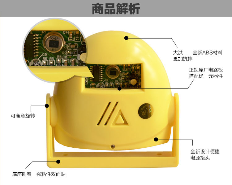 另有32首和弦音乐可选,声音4档可调。两种供电方式,探测距离约0-8米左右。红外感应准,品质保证,多色可选,无误报